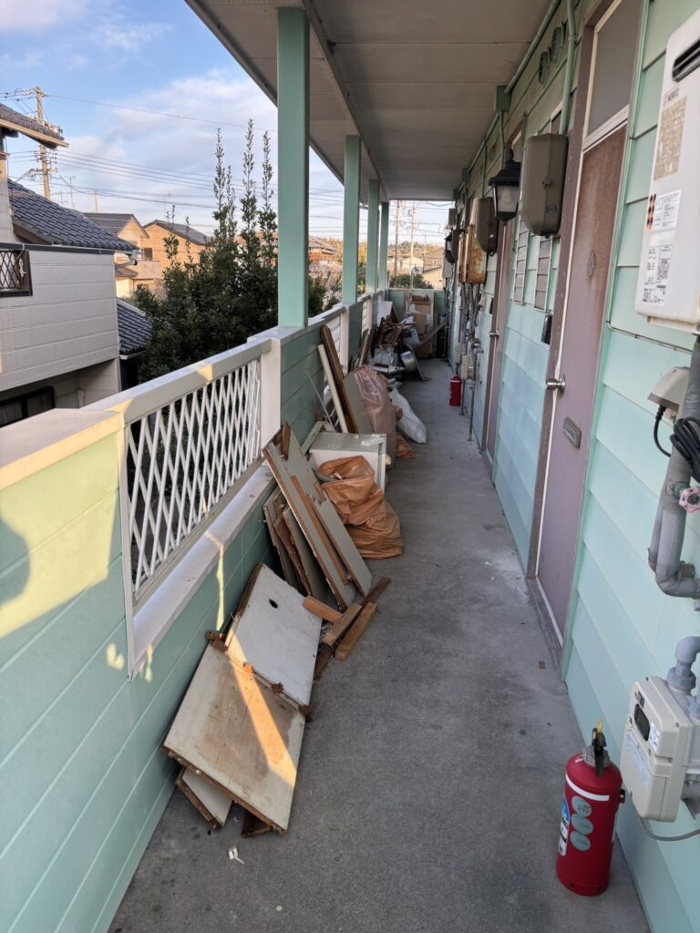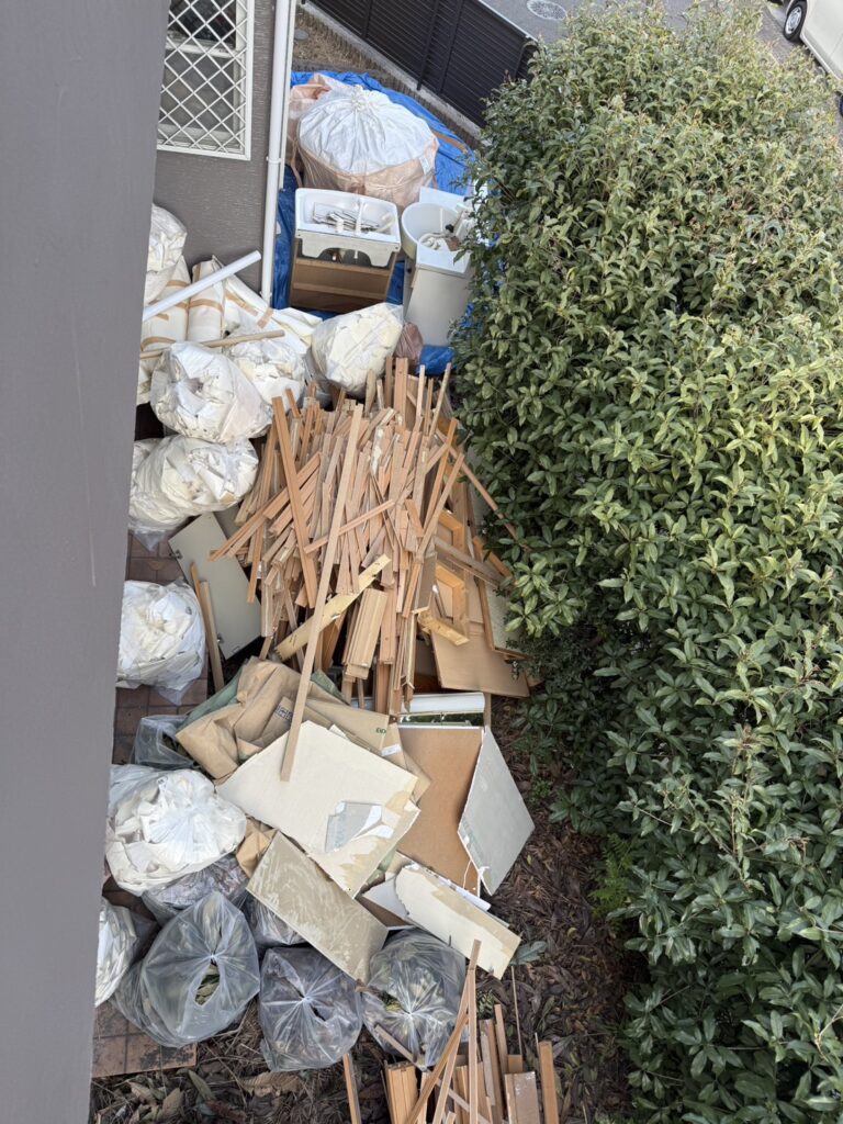 お引越しやリフォーム、大掃除の際など、「気づいたら自分では運び出せないほどの量になっていた」というご相談も少なくありません。 写真のようなアパートの共用部や、お庭に積まれた廃材なども、プロの手で迅速・丁寧に回収し、スッキリとした空間を取り戻します。